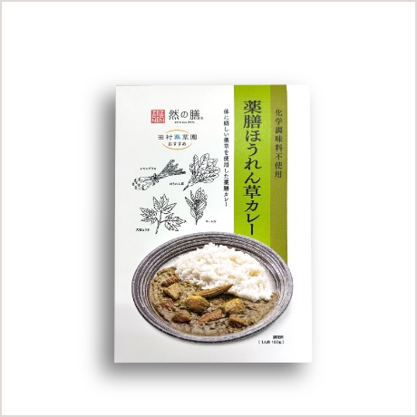体に嬉しい薬草を使用した、化学調味料不使用の薬膳カレーです。ほうれん草・大和当帰(やまととうき)・レモングラス・ローレルを使用。血行を促進し、血の巡りを良くしてくれる効果が期待できます。また胃腸の働きを助け、消化促進を促します。