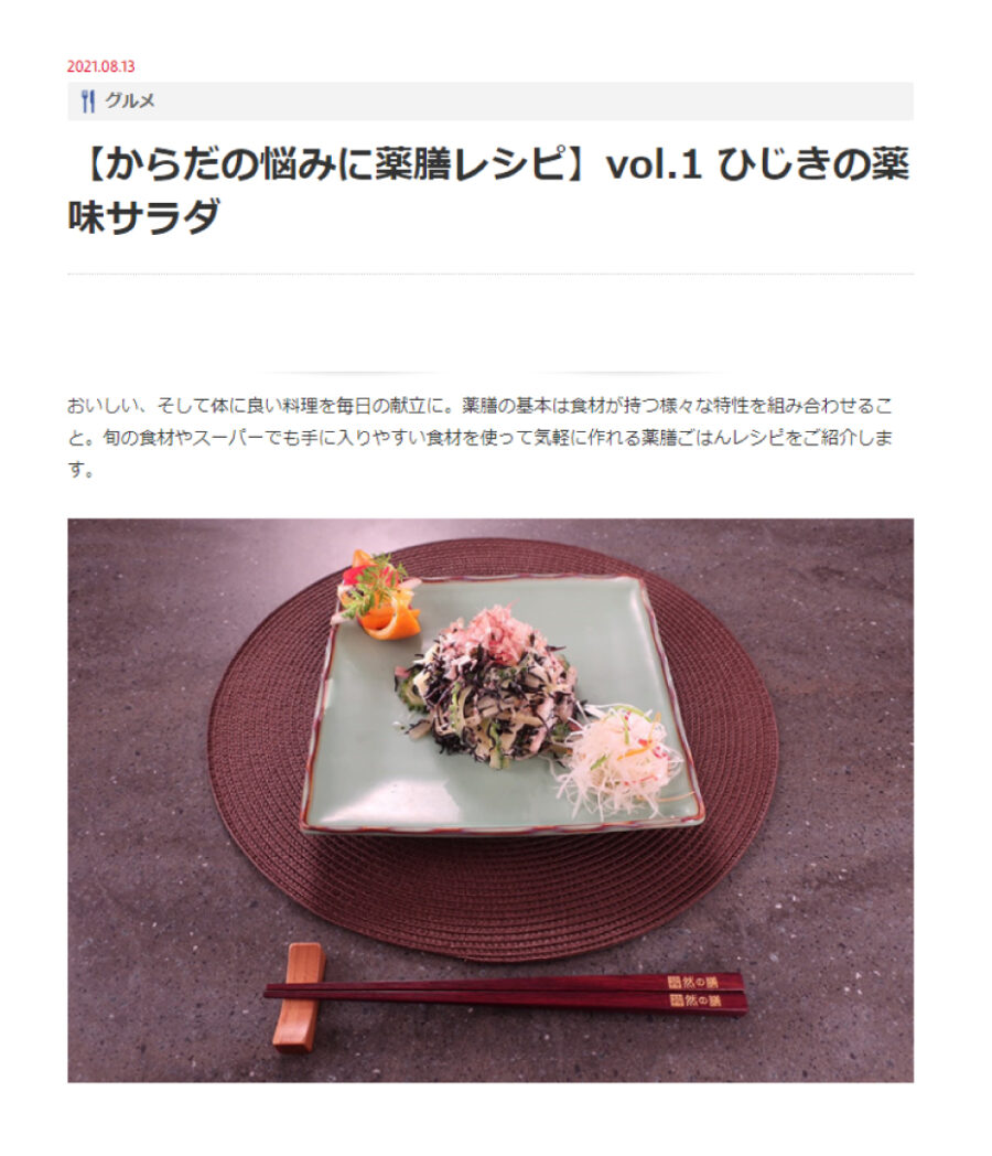 2021.08.17 当社の考案するレシピが地元の情報発信サイト『仙臺いろはWEB』の『【からだの悩みに薬膳レシピ】』に掲載されました。 レシピは『仙臺いろは』WEB上でもご覧いただけます! 前の記事へ 7月1日「然の膳 姫路赤十字病院店」OPENのお知らせ 次の記事へ 当社の考案するレシピが地元の情報発信サイト『仙臺いろはWEB』の『【からだの悩みに薬膳レシピ】Vol.2』に掲載されました。 ニュース一覧へ この記事を見た人は、こちらの記事も見ています ~手軽に薬膳~ レシピ動画【Vol.12】配信開始のおしらせ 【薬膳レシピ】暑い日におすすめスイーツ~おすすめ食材とレシピ集★ 【佐々木先生監修レシピ】リラックス効果でストレスの緩和に!「白身魚のムニエル 香味野菜つけあわせ」 【薬膳レシピ】血液サラサラ&筋肉ほぐしでこりを和らげる!「丸ごと玉ねぎの和風オニオングラタン風」