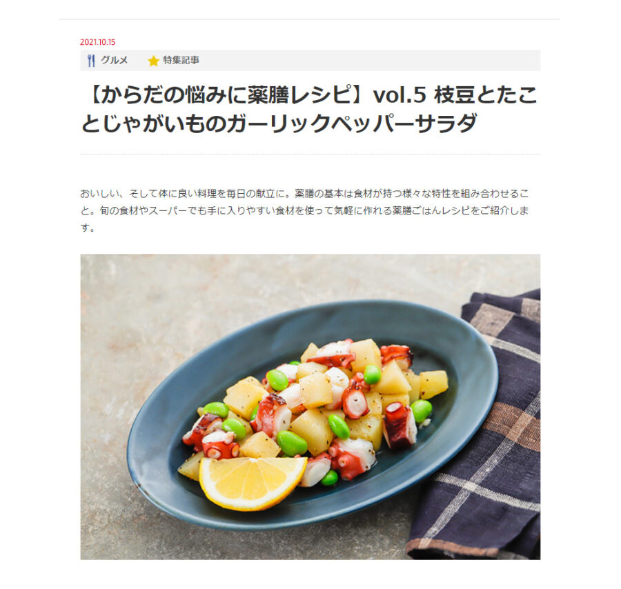 2021.10.15 当社の考案するレシピが地元の情報発信サイト『仙臺いろはWEB』の『【からだの悩みに薬膳レシピ】Vol.5』に掲載されました。 レシピは『仙臺いろは』WEB上でもご覧いただけます! ~オンラインショップにて、レシピ本販売中!!~ 大人気レストラン「然の膳」の世界一美味しいカンタン薬膳ごはん 前の記事へ 【期間限定ポイント10倍】旬を食べよう ~秋~ごぼうの食べる薬膳スープ販売開始!! 次の記事へ お待たせしました!かける薬膳【茶】再入荷!! ニュース一覧へ この記事を見た人は、こちらの記事も見ています 8/22放送!「イカと高菜のピリ辛和え」 【薬膳レシピ】ストレス解消!「シーフードと気巡り野菜のカレーライス」 【薬膳レシピ】冷え対策!体が温まる「くるみとにらの生姜みそ」 新商品!有機乾燥きくらげ【白】【黒】及びレシピ本、食材辞典の販売を開始しました。