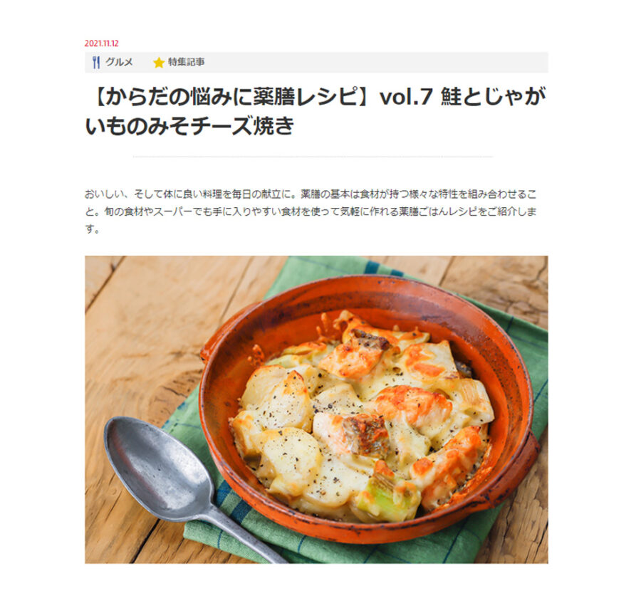 2021.11.12 当社の考案するレシピが地元の情報発信サイト『仙臺いろはWEB』の『【からだの悩みに薬膳レシピ】Vol.7』に掲載されました。 レシピは『仙臺いろは』WEB上でもご覧いただけます! ~オンラインショップにて、レシピ本販売中!!~ 大人気レストラン「然の膳」の世界一美味しいカンタン薬膳ごはん 前の記事へ ~手軽に薬膳~ レシピ動画【Vol.2】配信開始のおしらせ 次の記事へ 当社の考案するレシピが地元の情報発信サイト『仙臺いろはWEB』の『【からだの悩みに薬膳レシピ】Vol.8』に掲載されました。 ニュース一覧へ この記事を見た人は、こちらの記事も見ています 5/23放送!「ゆで豚の赤味噌ソースかけ」 新商品!然の膳 かける薬膳【紫】販売開始!! 【薬膳レシピ】むくみに!「フレッシュトマトソースの夏野菜オムレツ」 【薬膳レシピ】がっつり食べて疲労回復!「牛しゃぶのサラダビビンバ丼」