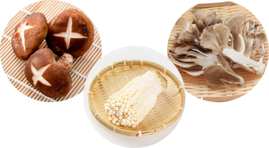 きのこ類は美肌や免疫力アップや疲労回復等の効果が期待できる食材。