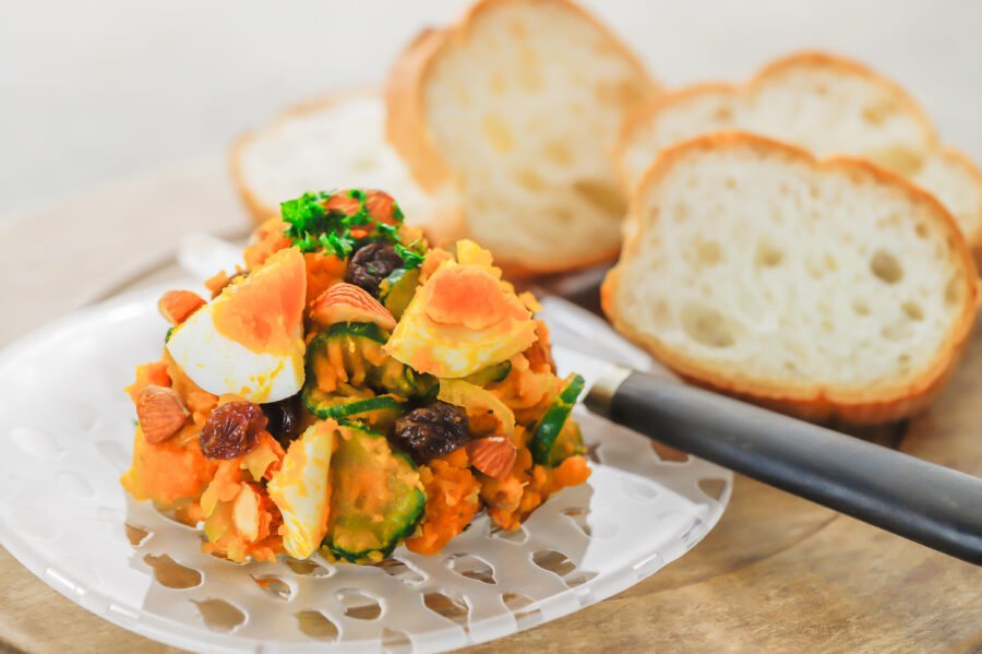 ③レンジからかぼちゃを取り出し、フォークでつぶし、水気を切った玉ねぎ、粗く刻んだアーモンドとゆで卵、レーズン、(A)を加え、よく混ぜ合わせる。