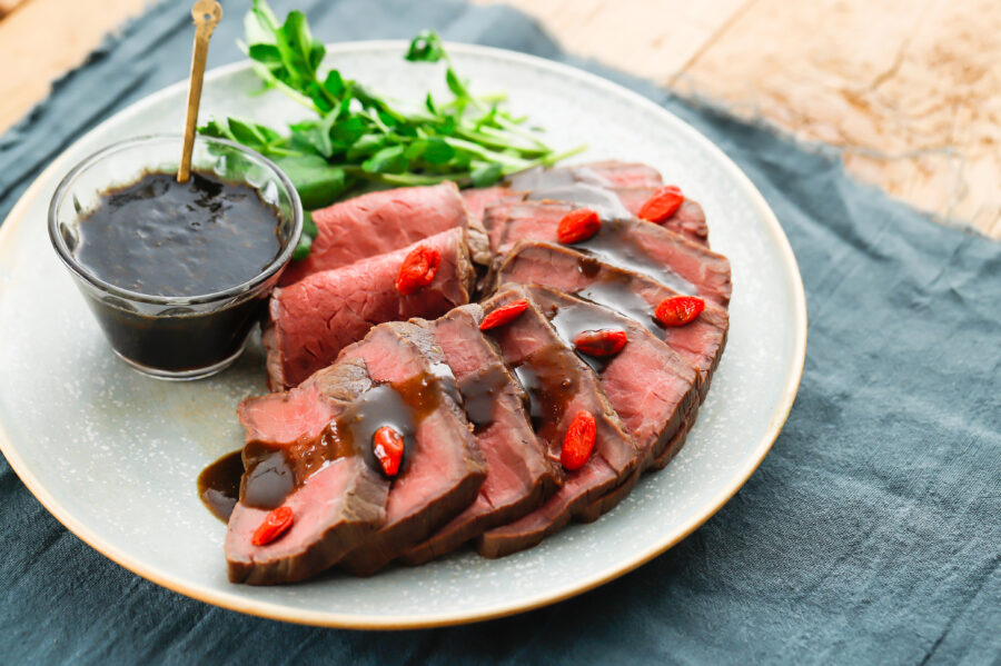 鉄分が豊富な牛肉を生薬でもあるクコの実、八角、そしてソースの黒ごまと一緒に摂ることでアンチエイジング効果が高まる一品。
