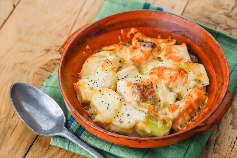 ▼体を温める2つの食材で冷え解消!「鮭とじゃがいものみそチーズ焼き」