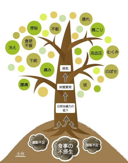 人間の体を「木」に例えると、木を支える土台を作るのが食事や睡眠、運動等です。健康な時はこの土台がしっかりしているので、栄養が体のすみずみまで行きわたり、「木」(体)は生き生きしています。ところが食事のバランスが崩れ、不規則な生活が続くと、土台が弱くなり、栄養が体のすみずみまで行きわたらなくなります。そして、葉っぱや花は傷んでしまいます。