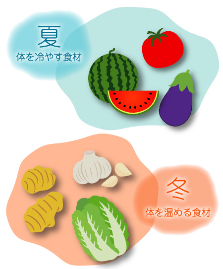 夏は体に熱がたまりやすいので体を冷やす食材を取り入れます。例えばトマト、なすび、スイカ等です。