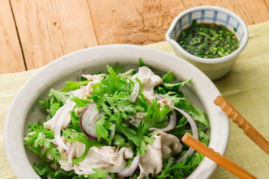①豚肉は沸騰直前のお湯でさっと茹で、水にとって水気を切り、一口大に切る。②紫玉ねぎは薄切りにし、水にさらし水気を切る。春菊は葉先をちぎる。