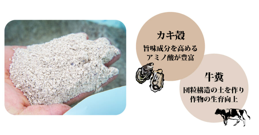 ・肥料に「カキ殻」と「牛糞」を使用しています。