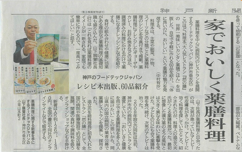 2021.01.28 当社のレシピ本『大人気レストラン「然の膳」の世界一美味しいカンタン薬膳ごはん』が 2021年1月22日 の『神戸新聞』に掲載されました。 前の記事へ 新商品!然の膳 オリジナルブレンド胡麻の販売開始!! 次の記事へ 新商品!然の膳 かける薬膳[茶]販売開始! ニュース一覧へ この記事を見た人は、こちらの記事も見ています 冬メニューはじまりました! 新商品!然の膳 かける薬膳「赤」と「黒」販売開始!! 当社の考案するレシピが地元の情報発信サイト『仙臺いろはWEB』の『【からだの悩みに薬膳レシピ】Vol.7』に掲載されました。 新商品!夏野菜の冷製薬膳トマトスープ販売開始!