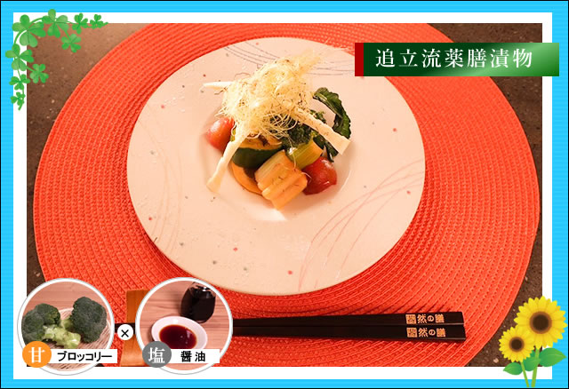 ★7/4に放送されました 「追立流薬膳漬物」 ですが、7/8(月)から「然の膳」で、然の膳オリジナルレシピにアレンジして …